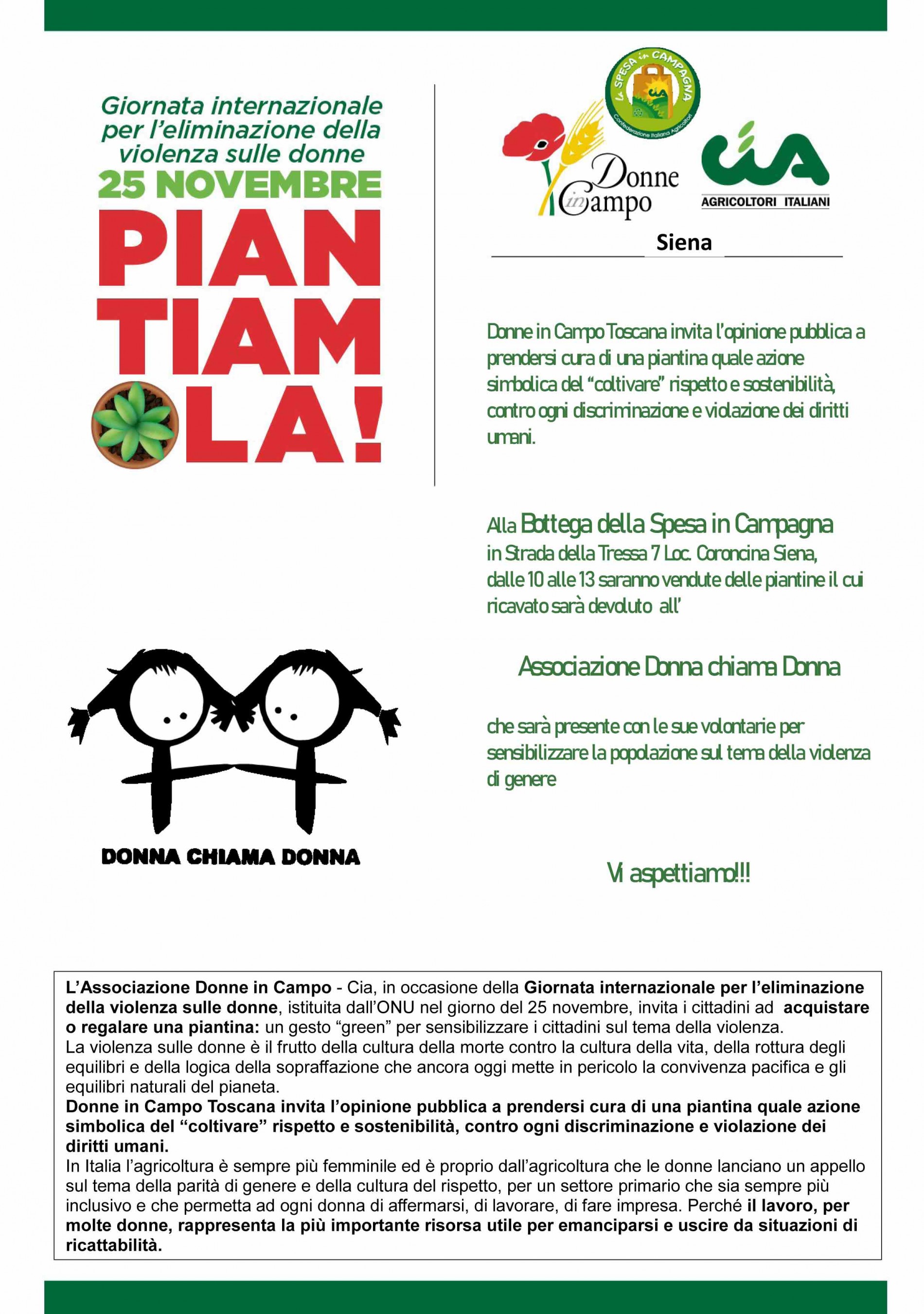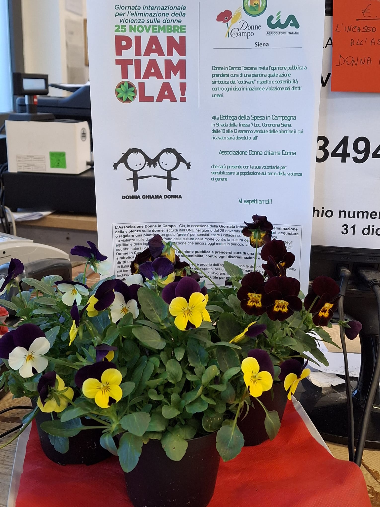 - Il 25 novembre a Siena, presso La Bottega della Spesa in Campagna, c'è stata la vendita di piantine in collaborazione con l'Associazione "Donna Chiama Donna" che si occupa del contrasto alla violenza di genere dando accoglienza e protezione alle donne e minori nativi e migranti, vittime di violenza fisica, psicologica, economica e sessuale.