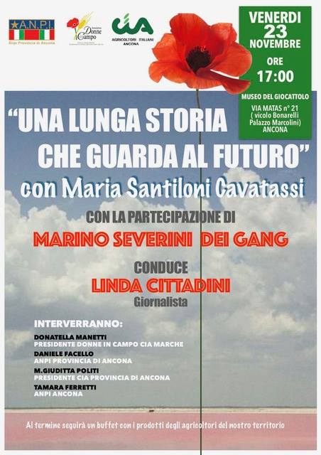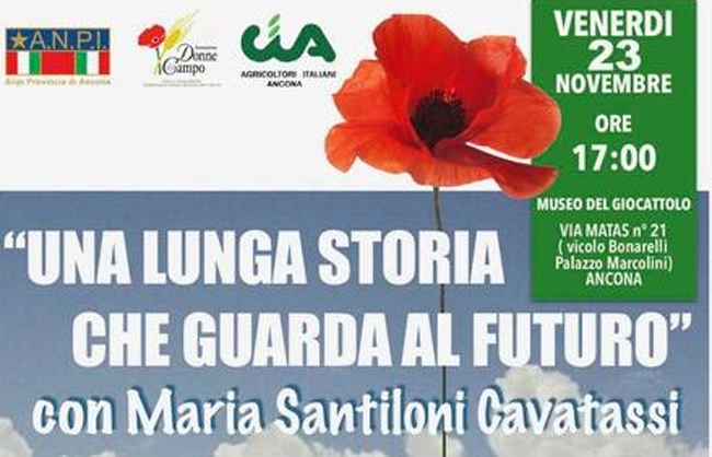L'incontro, condotto da Linda Cittadini, giornalista di E'TV Marche, e con la partecipazione di Donatella Manetti, Presidente Donne in Campo della CIA Marche, Daniele Fancello, Presidente provinciale ANPI Ancona, Maria Giuditta Politi, Presidente CIA della provincia di Ancona e Tamara Ferretti, Presidente ANPI Ancona, si è svolto venerdì 23 novembre p.v. alle ore 17.00 presso il Museo del giocattolo (g.c.), via Matas 21 (vicolo Bonarelli), Ancona.